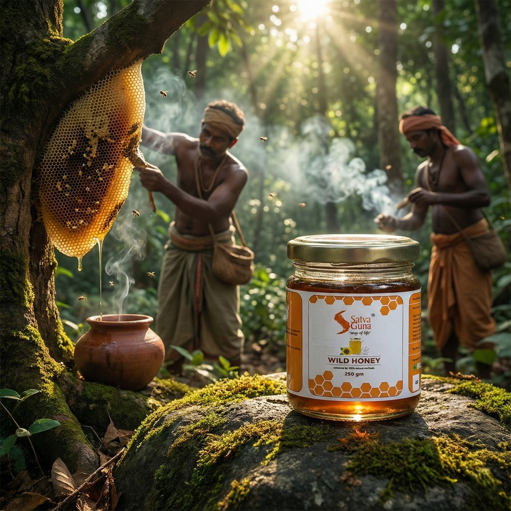 Each drop of SatvaGuna Wild Honey captures the untouched spirit of nature โ a sweet, golden gift that nourishes your body and soothes your soul.